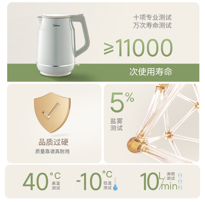 美的(Midea)电热水壶 2L大容量 1800W大功率速沸双层防烫 304食品级无缝内胆烧水壶 SH20M119